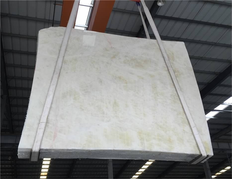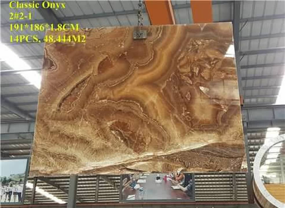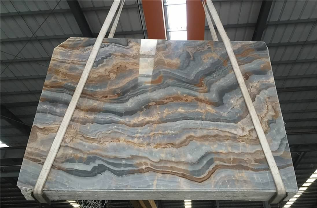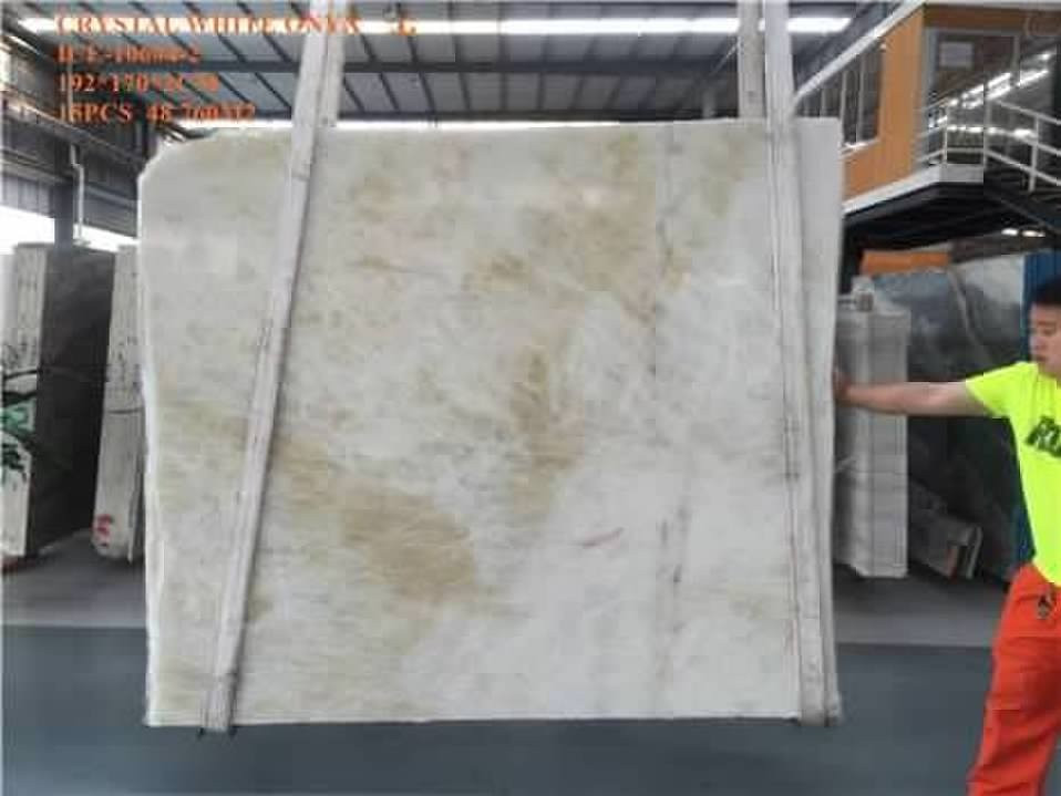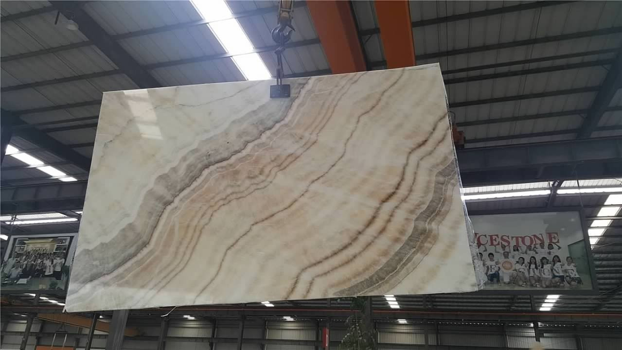 Onyx Crystal Marble looks like a gemstone, with wavy bands of color fused together in a fluid pattern. Onyx is considered part of the marble family because they both have the same mineral content. Onyx is not manufactured; it is a sedimentary rock, formed in cave interiors. Most slabs of Onyx are what a geologist would call banded calcite. This formation method results in the cryptocrystalline construction of the rock fabric, and it is the size and uniformity of these crystals that contribute to its classic translucent properties. Onyx is composed of, three simple ingredients; water, minerals, time. It is found in the mountainous regions and quarried in India, China, Italy, and Spain. Blocks are removed from the quarry; slabs are cut from the blocks and fabricated to be installed. Each block is different. Each slab is different. Slabs of Onyx are made by slicing down into the layers, revealing thousands of years of deposits.