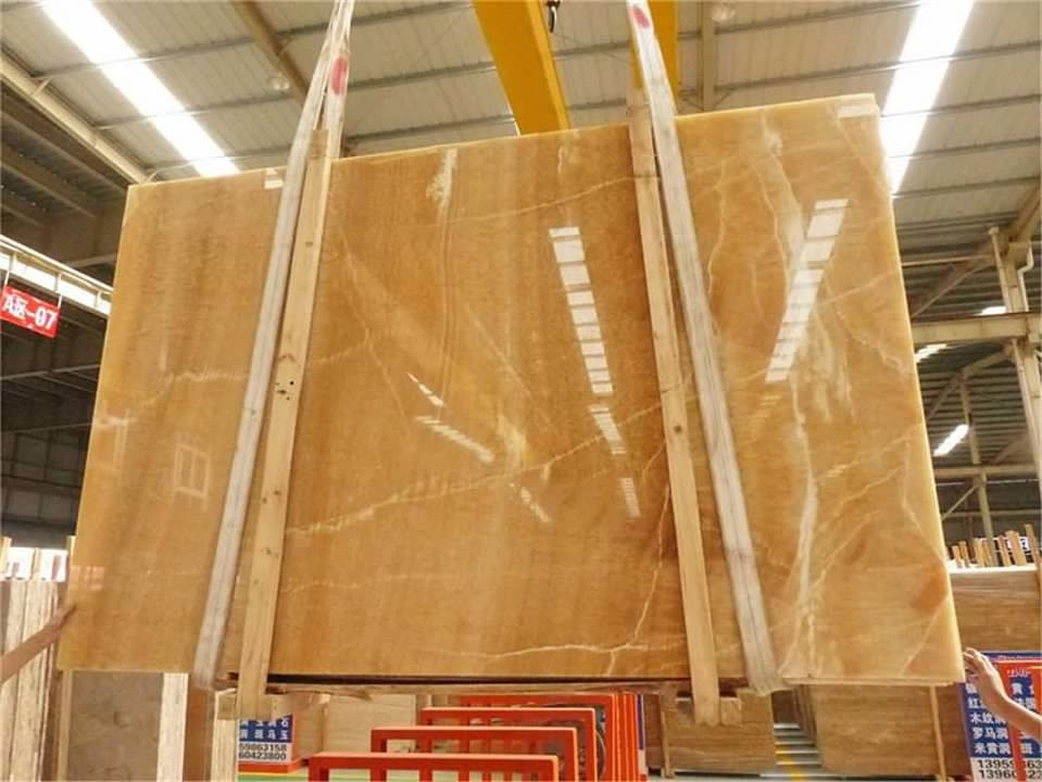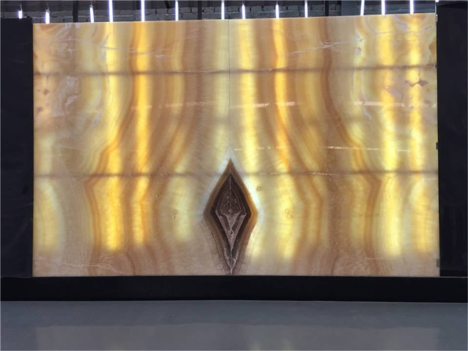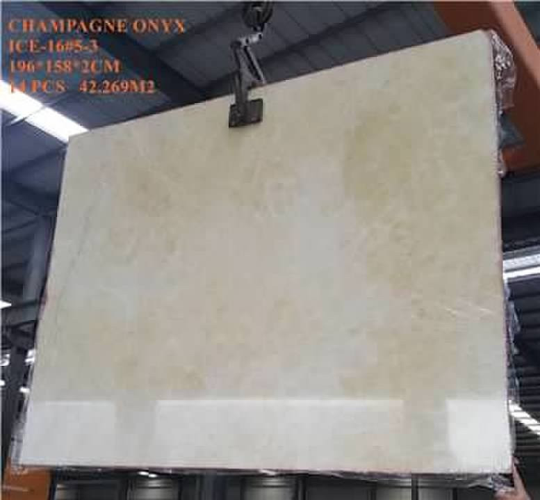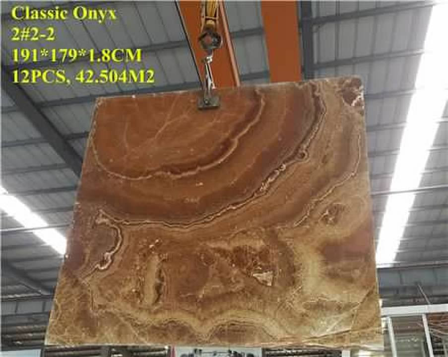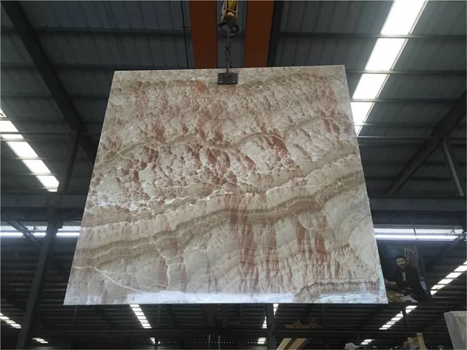 Onyx Crystal Marble looks like a gemstone, with wavy bands of color fused together in a fluid pattern. Onyx is considered part of the marble family because they both have the same mineral content. Onyx is not manufactured; it is a sedimentary rock, formed in cave interiors. Most slabs of Onyx are what a geologist would call banded calcite. This formation method results in the cryptocrystalline construction of the rock fabric, and it is the size and uniformity of these crystals that contribute to its classic translucent properties. Onyx is composed of, three simple ingredients; water, minerals, time. It is found in the mountainous regions and quarried in India, China, Italy, and Spain. Blocks are removed from the quarry; slabs are cut from the blocks and fabricated to be installed. Each block is different. Each slab is different. Slabs of Onyx are made by slicing down into the layers, revealing thousands of years of deposits.