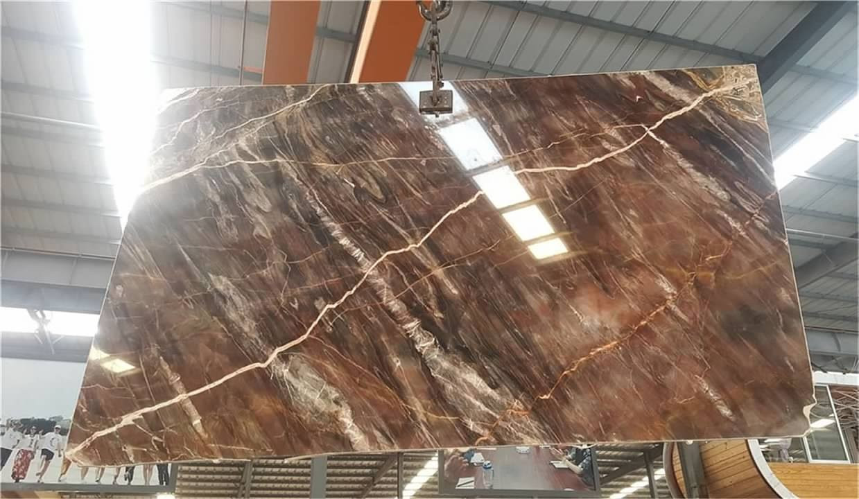 Onyx Crystal Marble is a rock made of alternating layers of different colored calcite with alternating bands. A close-up of onyx slabs, reveal the intricate crystals of calcite and iron-rich color banding. Veins of banded calcite Onyx, forms from spring water or groundwater that has an abundance of calcite dissolved in it. When this water emerges at the mouth of a spring, the minerals come out and build a crust of calcite crystals. Over time, more water flows and more minerals settle out. The variations between the layers are caused by differences in the water flow rate and small amounts of impurities. In its most pure state calcite is white or clear, but it’s easily tinted by minor amounts of other minerals. The flowing layers of Onyx reflect subtle variations in the spring water, and add an artistic quality to the patterns and bands.